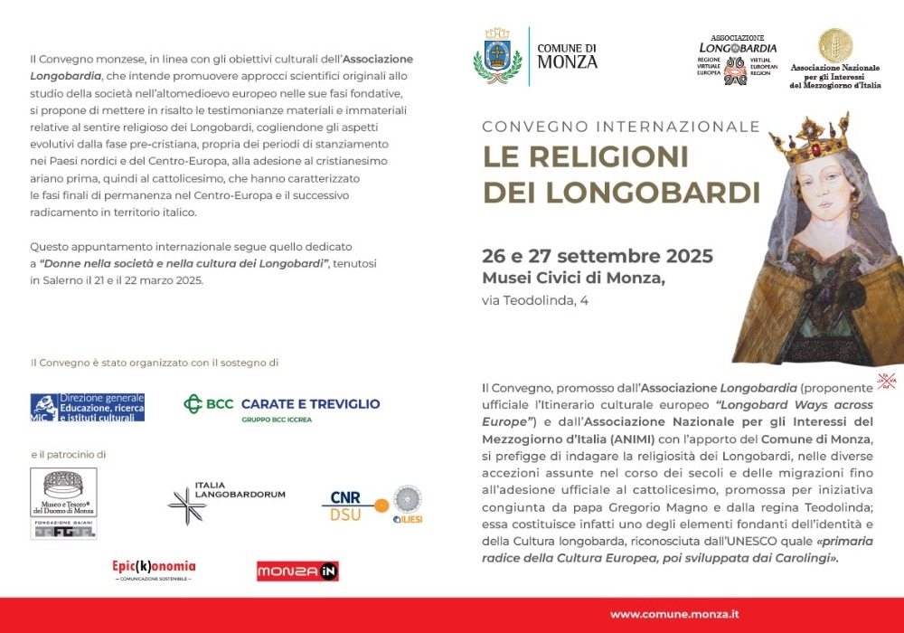 Un convegno internazionale è in programma a Monza - sede dei Musei Civici - nelle giornate del 26 e 27 per approfondire il tema della religiosità dei Longobardi: un argomento fondamentale considerandone le diverse accezioni assunte nel corso dei secoli e delle migrazioni fino alla adesione finale al cattolicesimo promossa per iniziativa congiunta della regina Teodolinda e di Papa San Gregorio I Magno. Le idealità cristiano-cattoliche sono infatti alla base della maturazione della Cultura longobarda oggi riconosciuta quale “primaria radice della Cultura Europea, poi sviluppata dai Carolingi”.